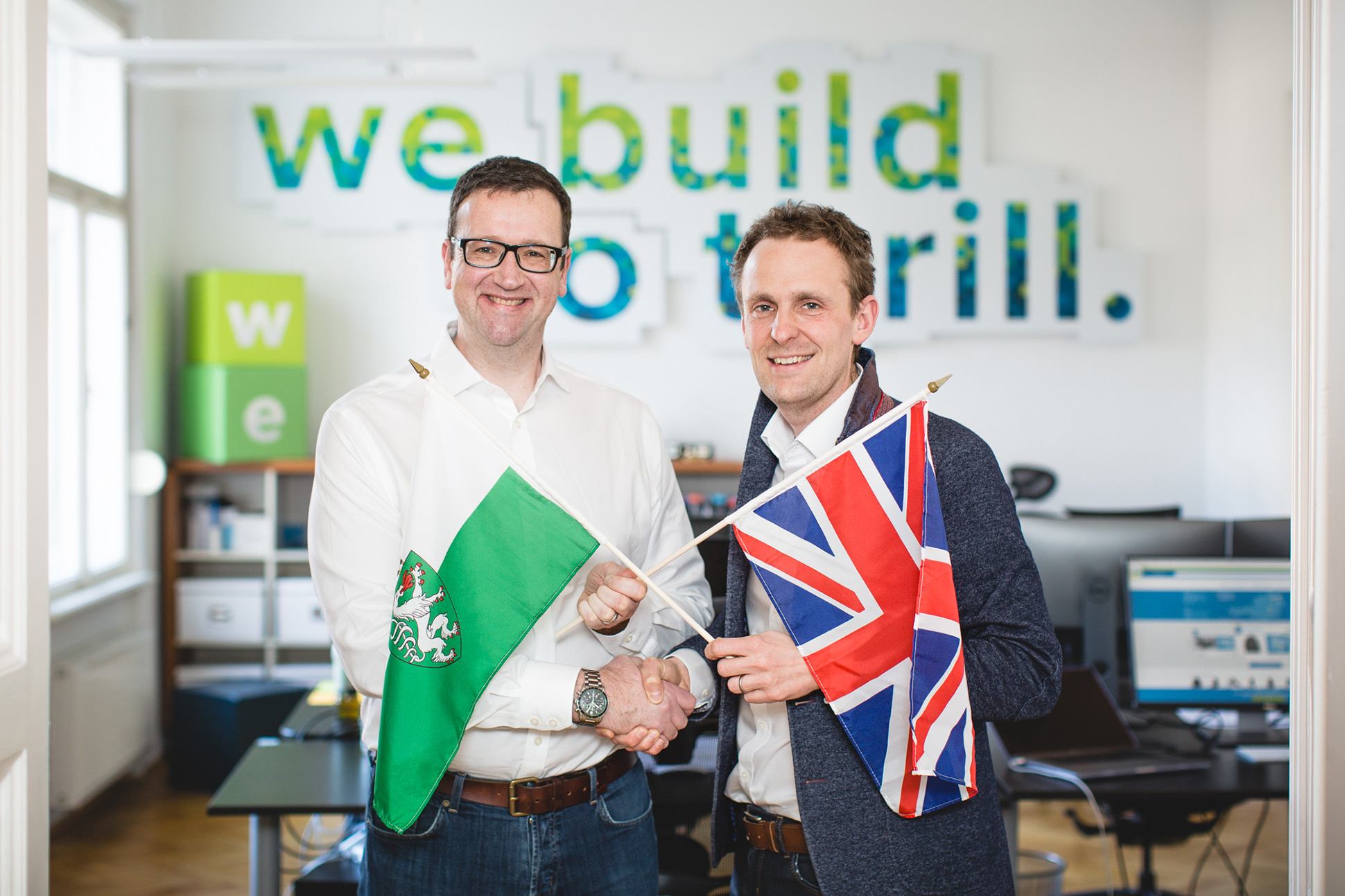Tech director Jürgen Blematl heißt Matt Pearce (links) bei AURENA willkommen; Bild: aurena.at