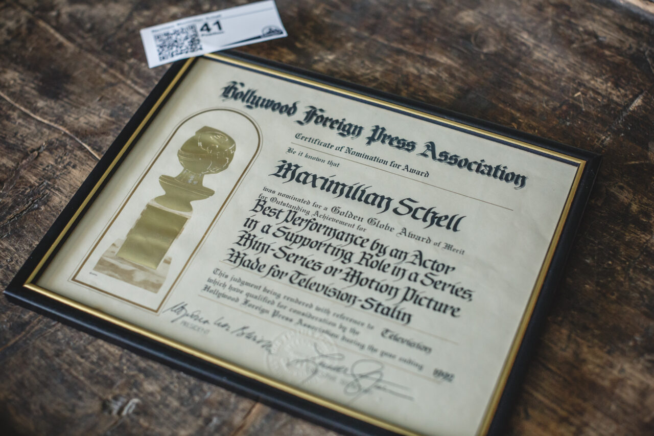 Die Positionen dürften die Herzen von Sammlern und Fans des charismatischen Künstlers höher schlagen lassen: Zu ersteigern sind etwa Maximilian Schells Golden Globe-Zertifikat für den Film „Stalin“, Schells Laurel Award 1962 für den Film „Urteil von Nürnberg“ oder mehrere Nominierungen beim London Film Festival.